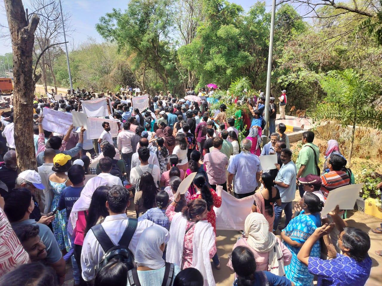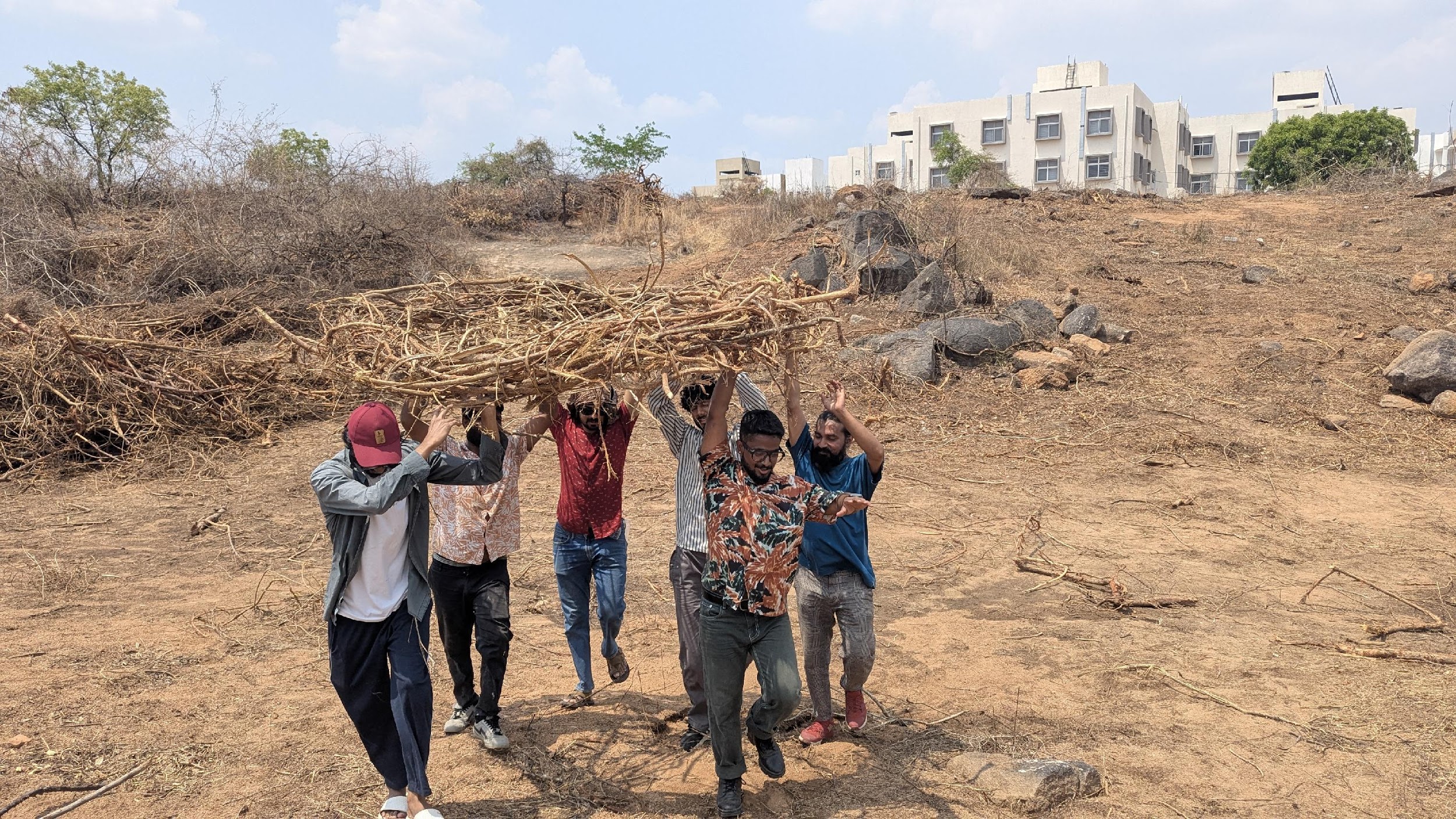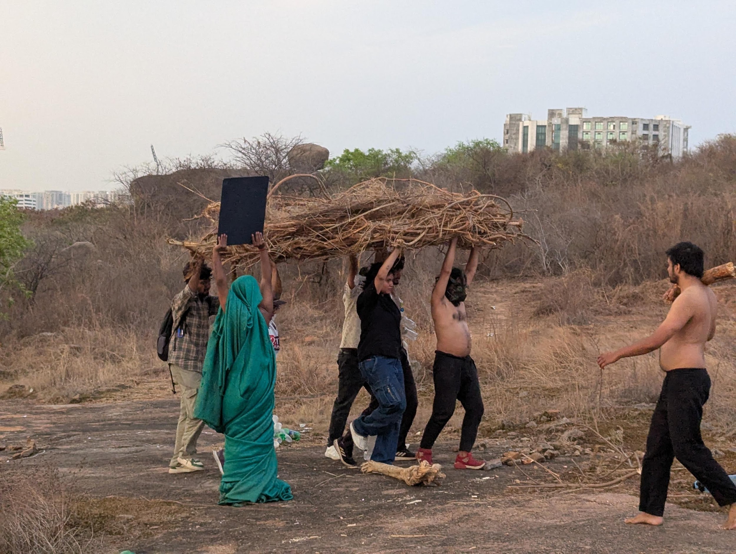 The performance unfolded amid a student-led movement at the University of Hyderabad that successfully halted the auction and deforestation of nearly 400 acres of ecologically significant forest land (see Figure 1). The protests—anchored in solidarity, care, and collective refusal—had already disrupted the narrative of inevitability around ‘development’. Possible Futures chose this moment to create a work that echoed and deepened the call to action. The slogan of the protests—’Hum jungle bachane nikle hain… Aao hamare saath chalo’ (We have come out to save the forest… Come, walk with us)—was not merely a chant, but a living invocation woven into the performance itself.