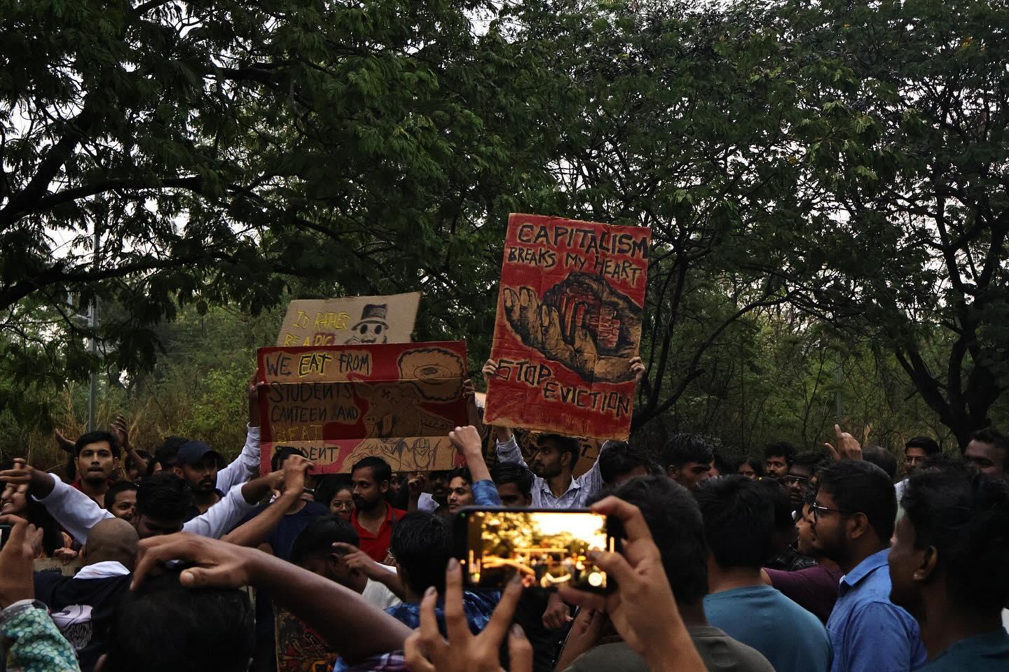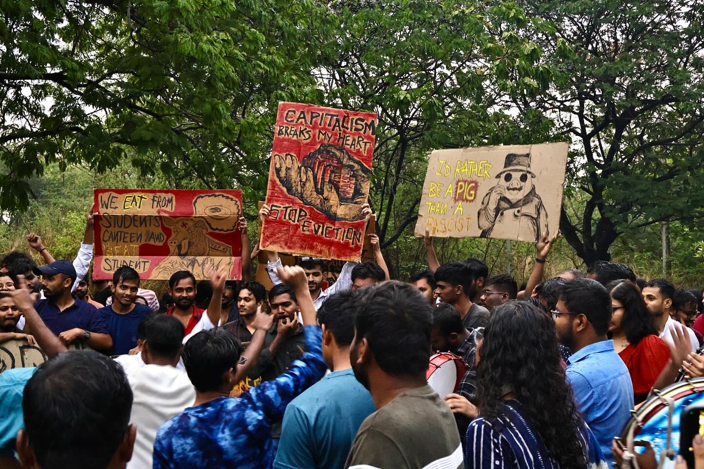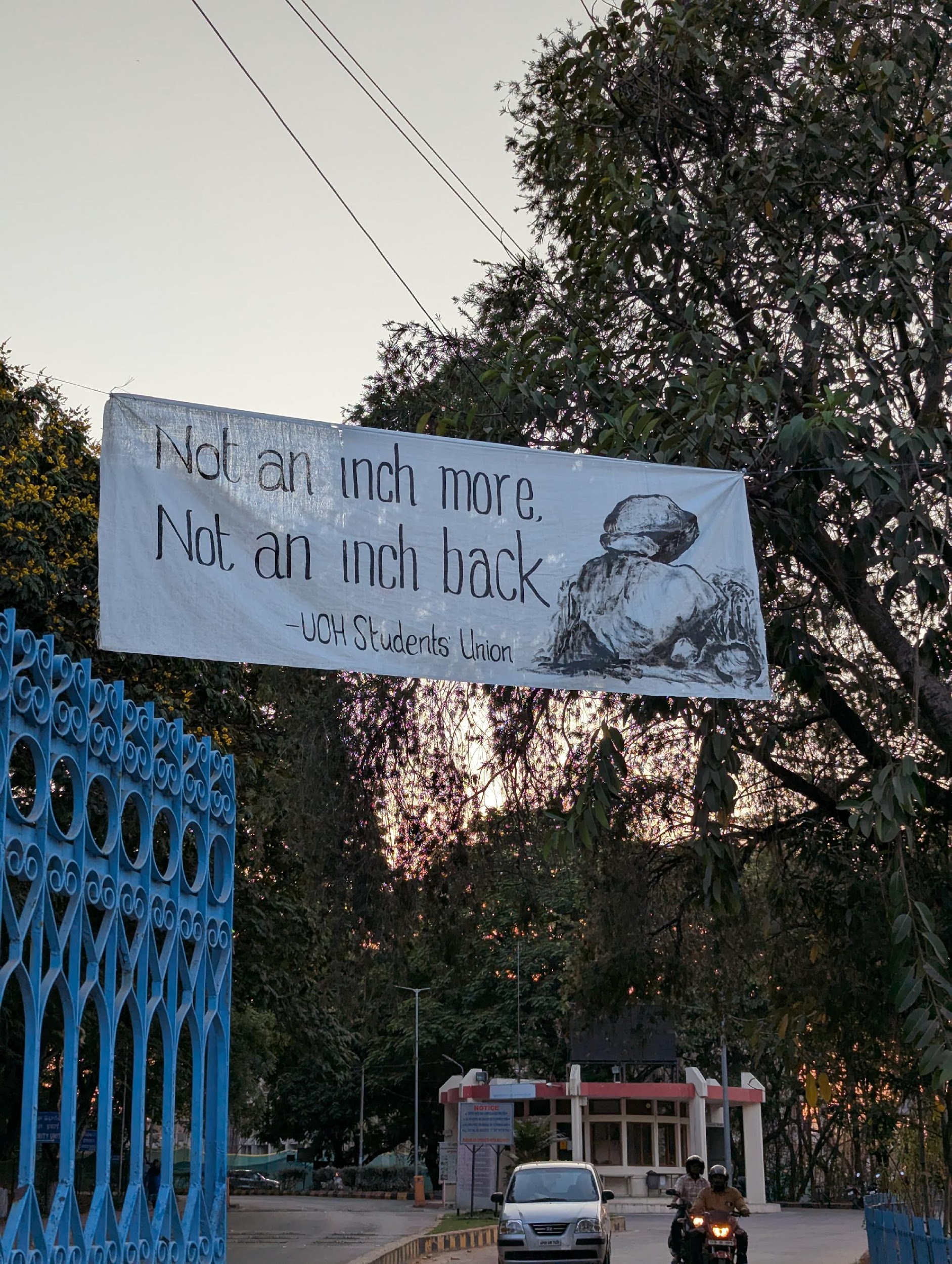 The performance unfolded amid a student-led movement at the University of Hyderabad that successfully halted the auction and deforestation of nearly 400 acres of ecologically significant forest land (see Figure 1). The protests—anchored in solidarity, care, and collective refusal—had already disrupted the narrative of inevitability around ‘development’. Possible Futures chose this moment to create a work that echoed and deepened the call to action. The slogan of the protests—’Hum jungle bachane nikle hain… Aao hamare saath chalo’ (We have come out to save the forest… Come, walk with us)—was not merely a chant, but a living invocation woven into the performance itself.