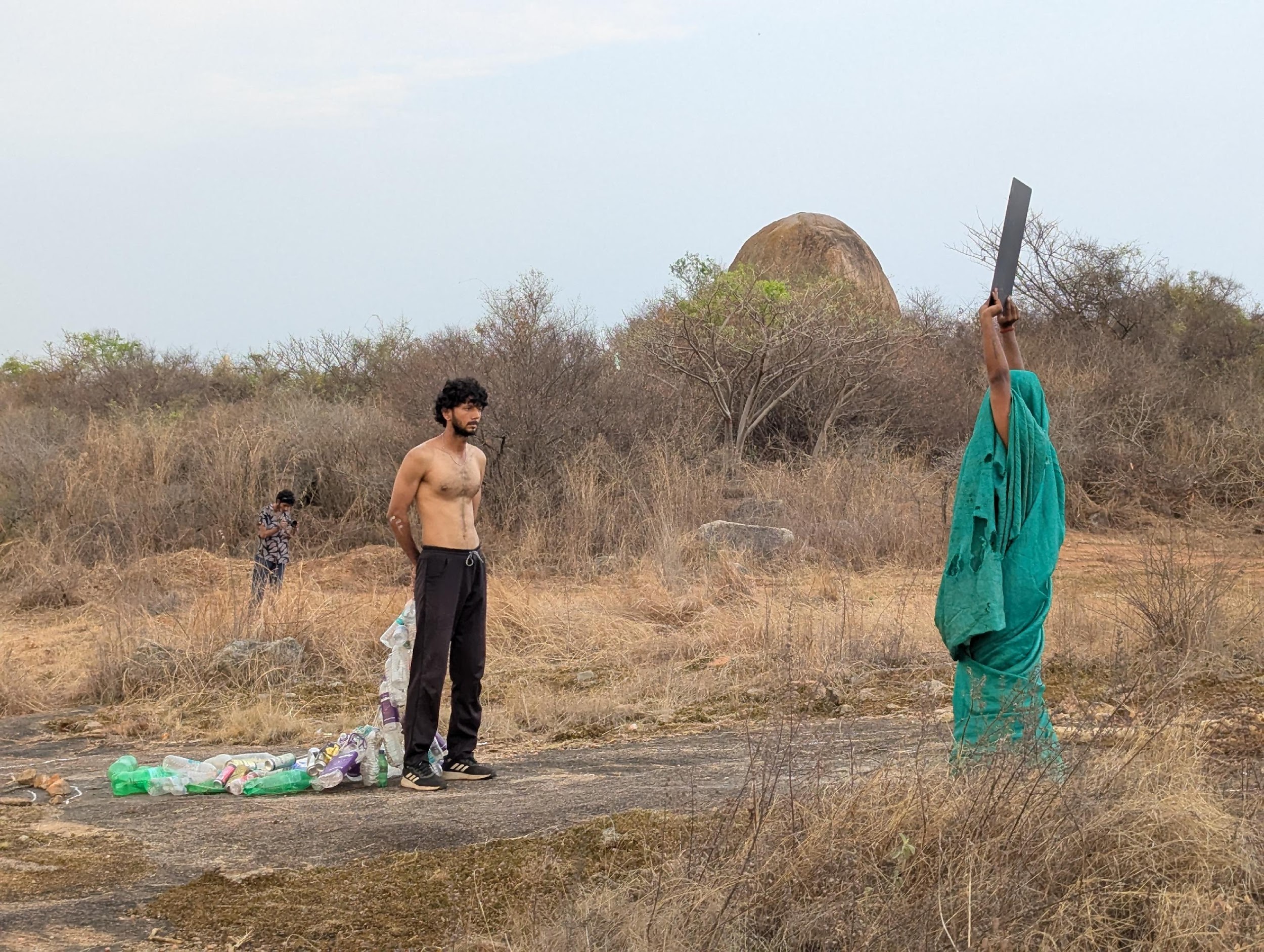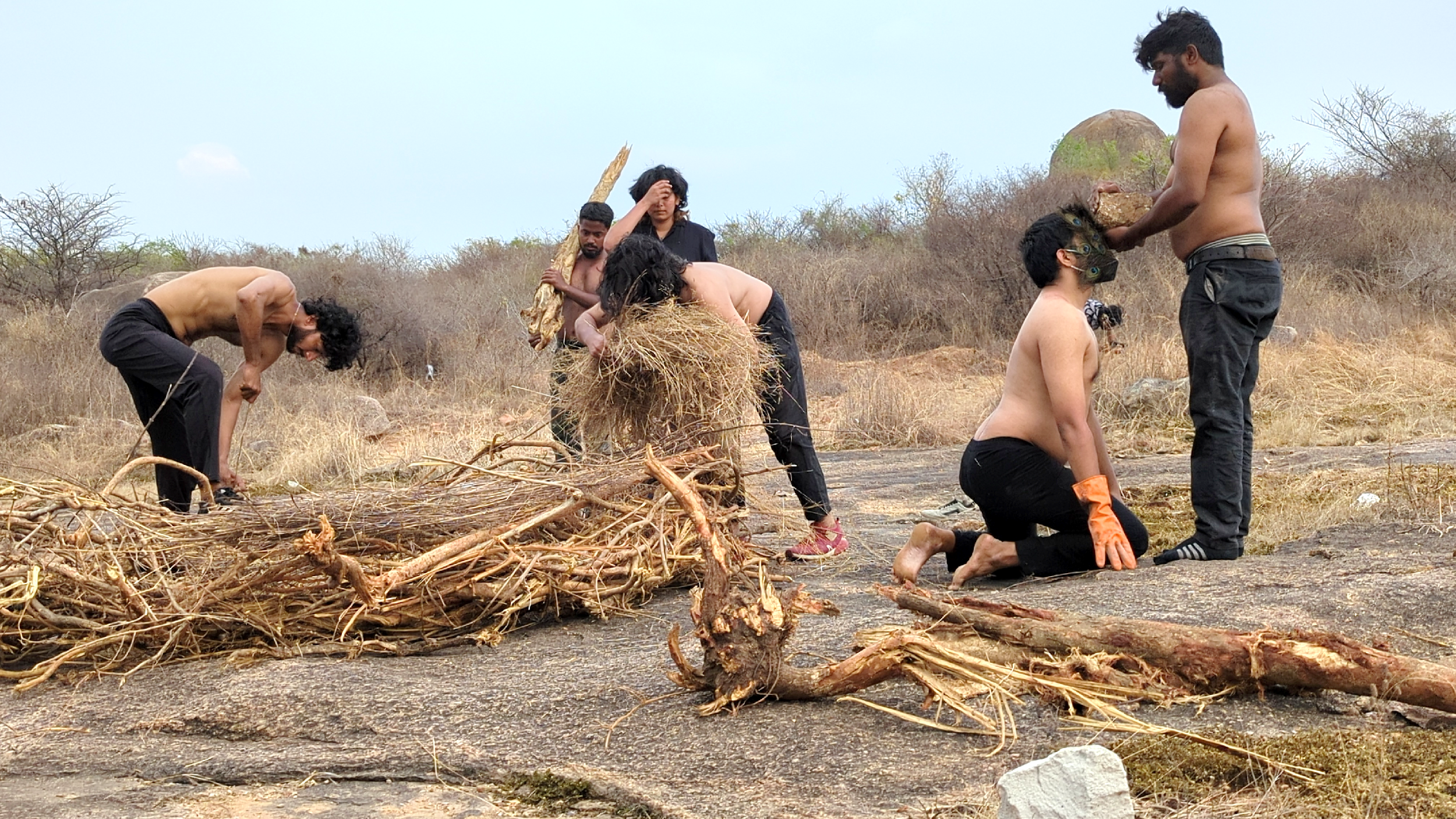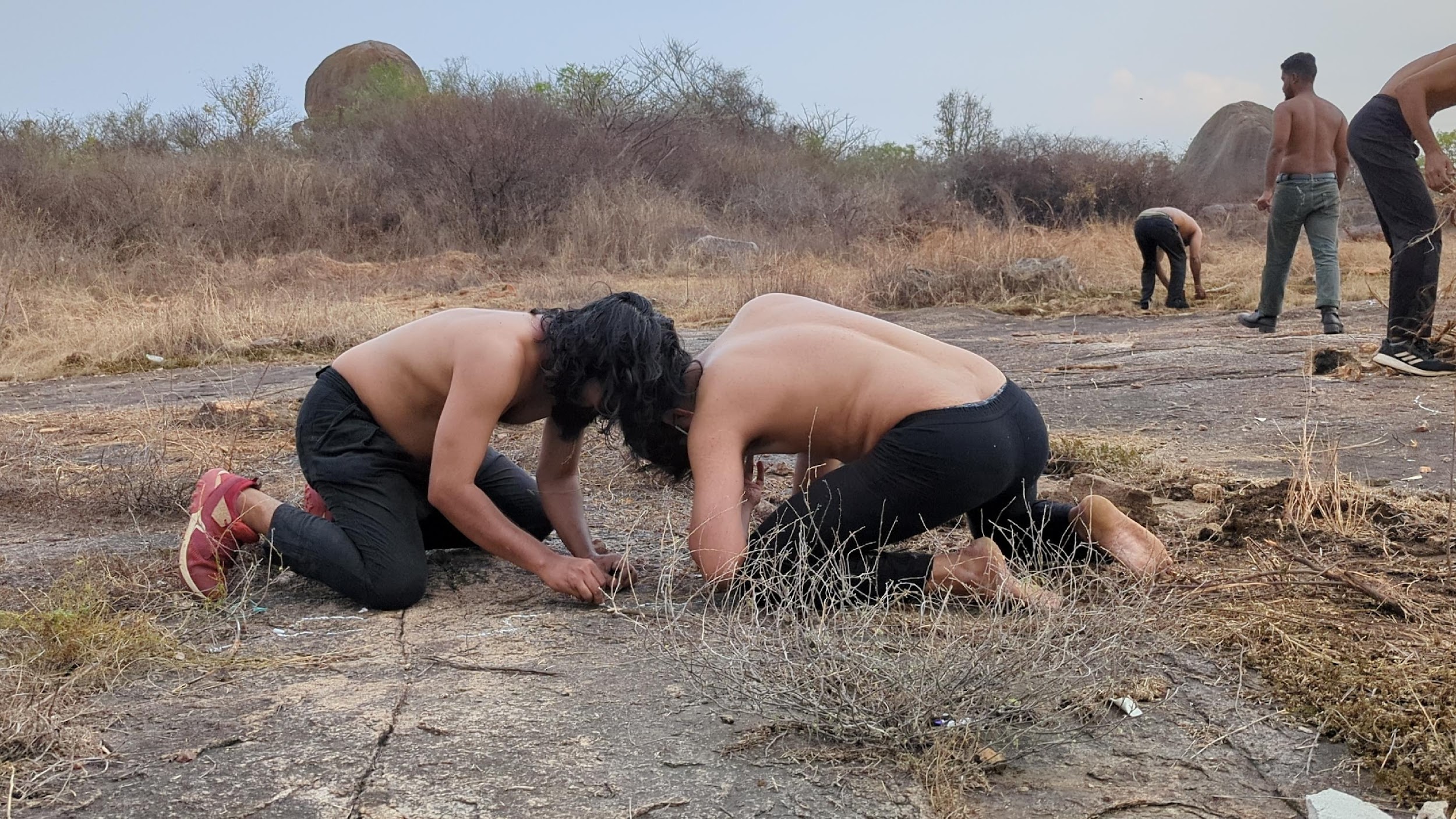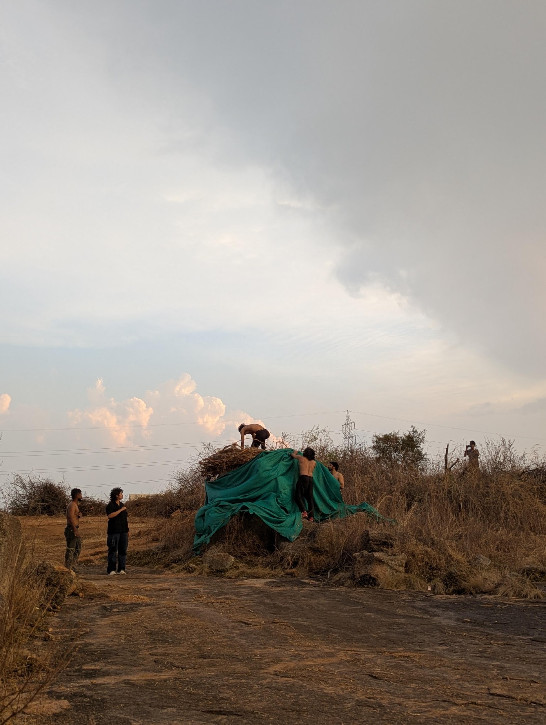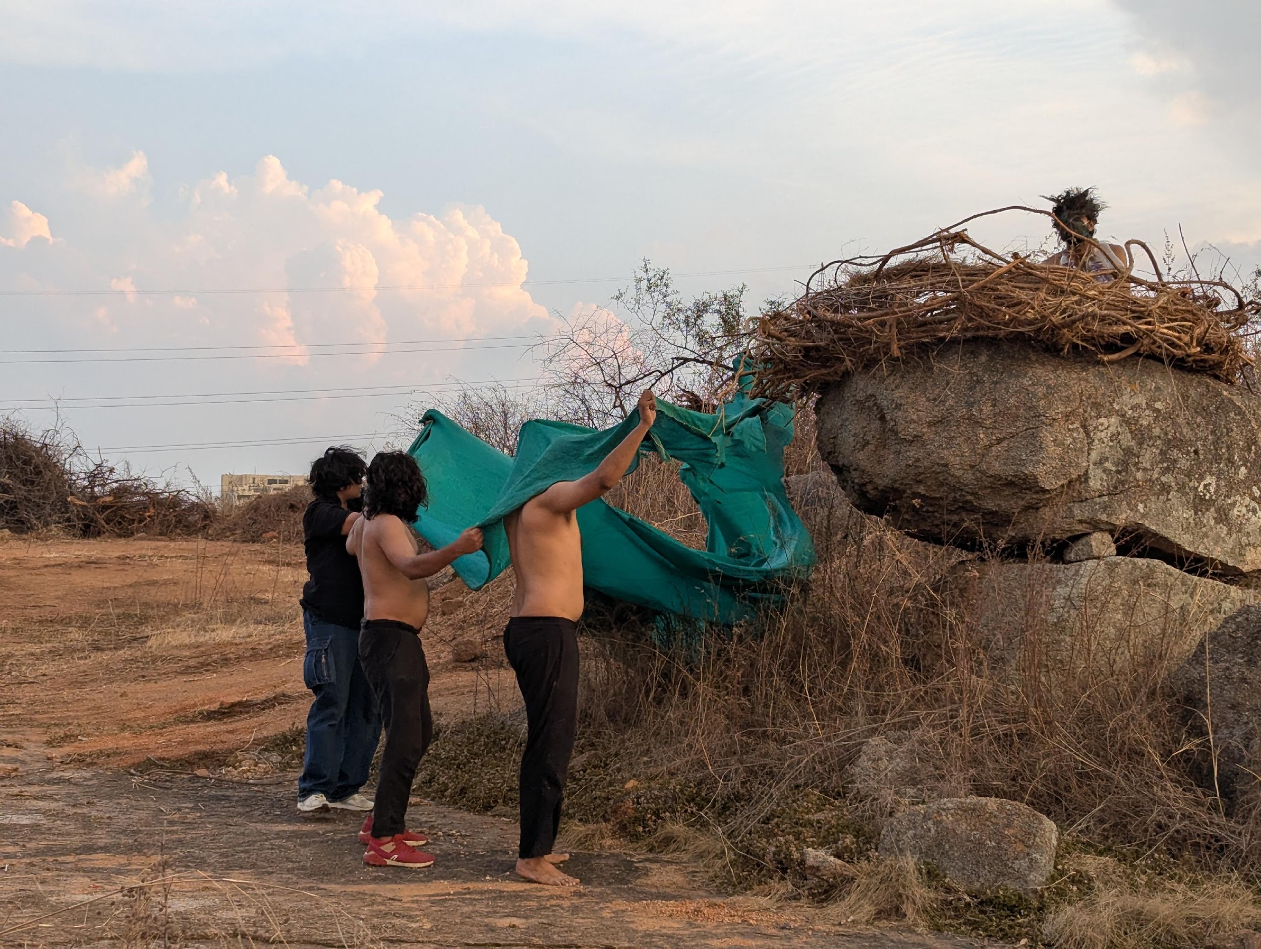 The central image of the performance was a nest: a giant, hand-woven structure of branches, grass, and roots gathered from the site. This act of making—slow, collaborative, physical—became a living metaphor for refuge, care, and reclamation. The performers enacted distinct yet interconnected gestures of resistance, memory, and care (see Figures 4a–4e): Vignesh traced shadows and imprints of bodies and objects, evoking memory and impermanence. Shivam, shifting between human, bird, and animal, called out with sounds of longing and distress, bridging species. Suresh carried and struck stones until they shattered, conjuring the violence of construction and human labour. Bhanu, wrapped in green construction netting, held a mirror aloft, reflecting and fragmenting the landscape in a quiet question of visibility and erasure. Vishal dragged discarded plastic bottles while singing a Bhojpuri folk song about forests and water, his voice gathering the others into a collective chorus that transcended language and region. Manjari knelt before rocks, whispering to them and arranging them in a quiet ritual of reverence.
